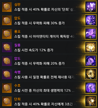묵법:호접몽 123 심판 - 낙인용 스킬으로 히트수가 많아서 심판룬을 채용 했습니다. 단죄+심판이 잘 안터질경우 스킬을 필법:먹물세례(112)로 바꿀 예정입니다.