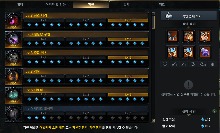 각인은 얼마전에 새로 맞춰줘서 각성3 절실한구원3 전문의3 중갑착용3 급소타격3 입니다.