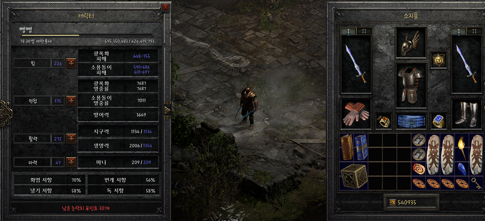 처음에 시작할때 시곤셋(방패는 쌍수무기 하려고 안씀) 천사목걸이, 반지 // 유혈자쌍(34//33) // 슬픔쌍 이렇게 들고 했는데, 생각보다 초반부터 힘들더라구요.