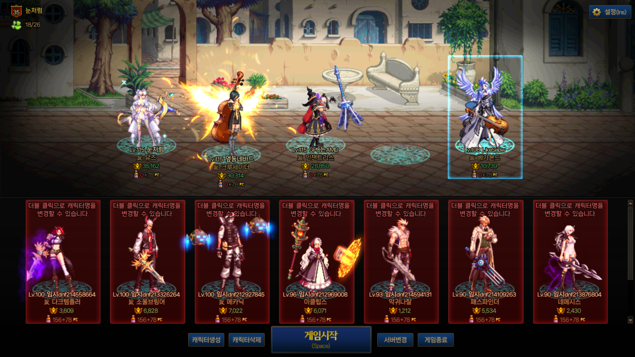 던파에서도 서포터 한번 해 보고싶어서 서폿 3캐릭(남캐는 하기싫...)에 기존에 본캐였던(것으로 보이는) 베가본드 이렇게 키워볼까 합니다.